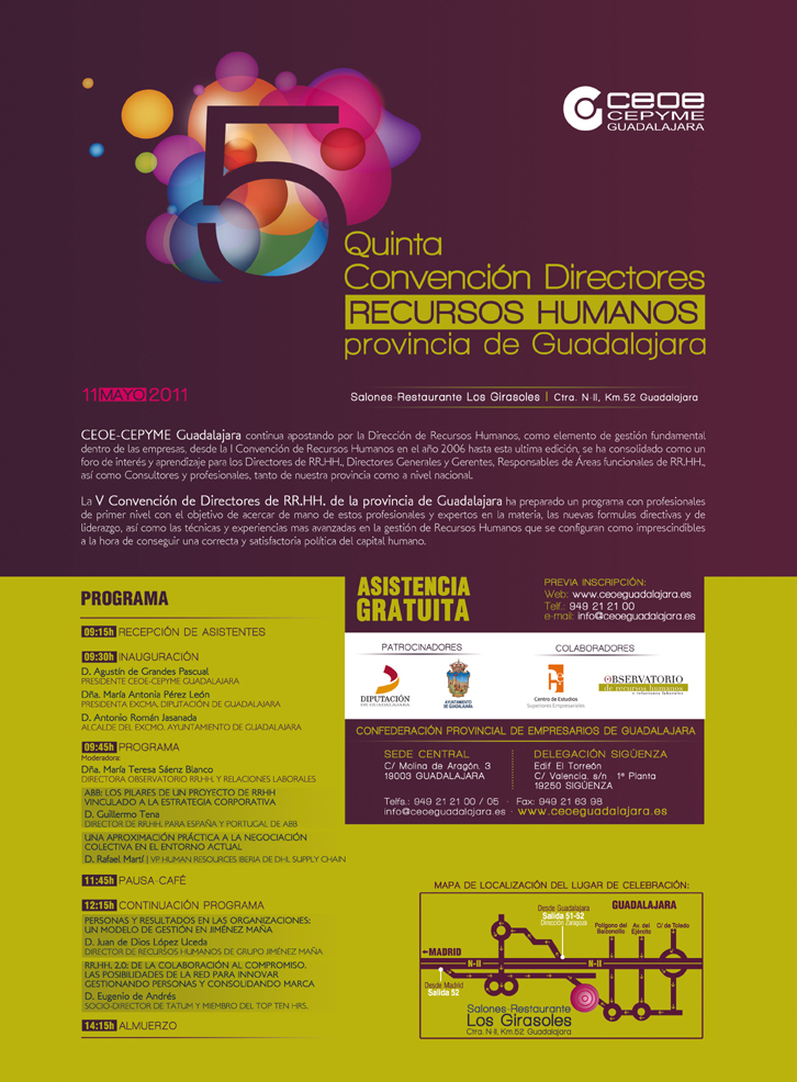 Guadalajara, 6 de mayo de 2011, CEOE-CEPYME Guadalajara celebrará el miércoles 11 la V Convención de Directores de Recursos Humanos. Esta es una acción más en su apuesta por la dirección de los recursos humanos en las empresas como un elemento fundamental en su gestión.