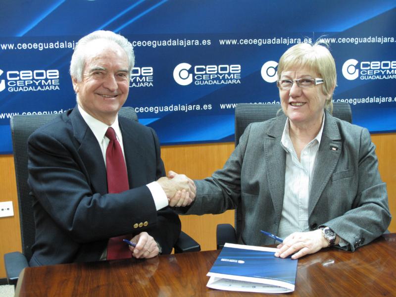 Guadalajara, 16 de febrero de 2012, El presidente de CEOE-CEPYME Guadalajara, Agustín de Grandes y Carmen Hernández, presidenta del comité provincial de Cruz roja Española en Guadalajara, han suscrito esta mañana un convenio de colaboración donde se prioriza el desarrollo de actuaciones específicas con colectivos vulnerables, concretamente, en lo referido al empleo.