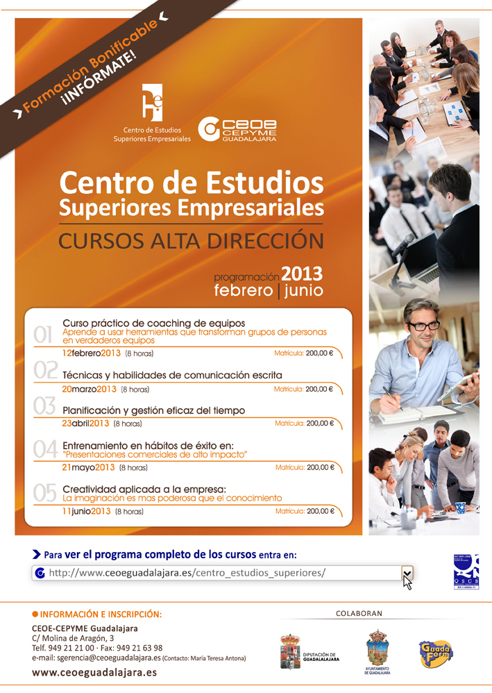 Guadalajara, 15 de enero de 2013, CEOE-CEPYME ha dado a conocer los cursos de alta dirección que imparte por medio del Centro de Estudios Superiores Empresariales. Una planificación formativa para este primer semestre del año y que continúa un año más dado el éxito de las ediciones anteriores.