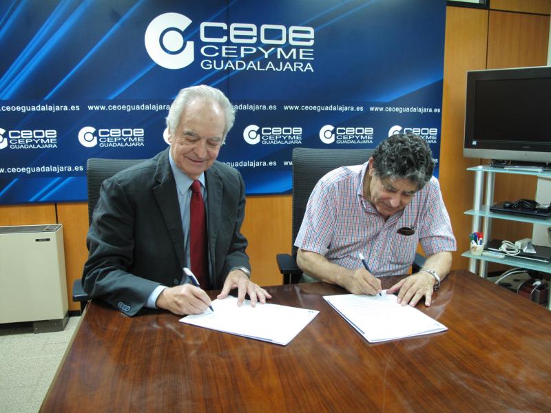 Guadalajara, 30 de julio de 2014, CEOE-CEPYME Guadalajara y la Asociación Española contra el Cáncer, en la delegación de Guadalajara, han firmado, concretamente sus presidentes, Agustín de Grandes y José María Jiménez Bustos, respectivamente, un convenio de colaboración, por el cual, la Patronal alcarreña colaborará, con una aportación económica, en el desarrollo del proyecto “estudio en preadolescentes y adolescentes de nuestra provincia de cotinina en orina”. Donde se estudiarán los hábitos saludables de este rango de población.