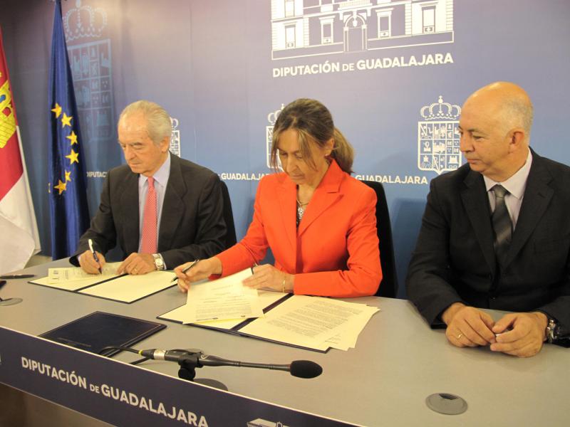 La presidenta de la Diputación, Ana Guarinos, ha firmado un convenio de colaboración con el presidente de la patronal alcarreña, Agustín de Grandes, para distintas acciones de promoción del tejido empresarial de la provincia