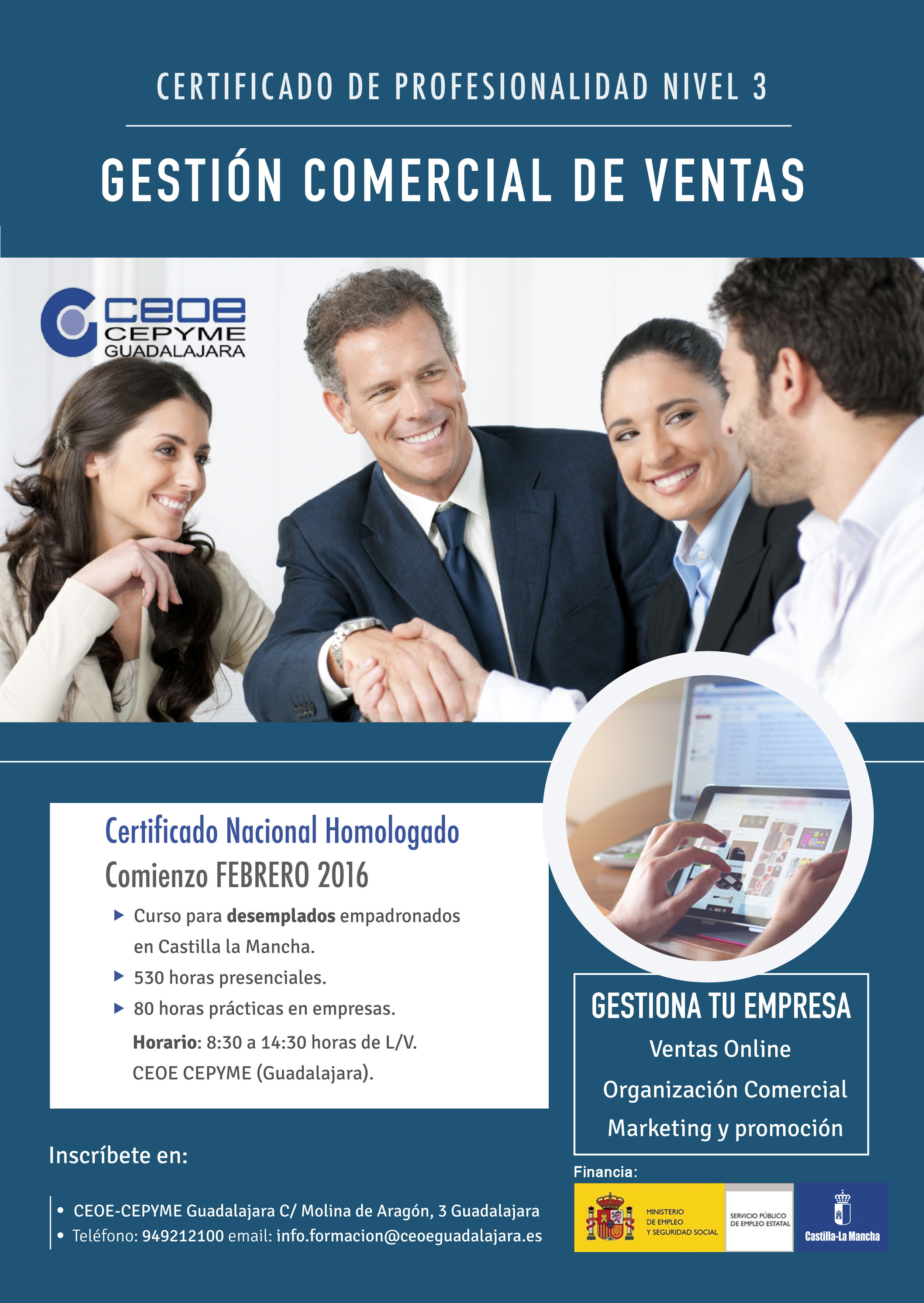 Guadalajara, 5 de febrero de 2016, El departamento de Formación de CEOE-CEPYME Guadalajara está informando de las últimas plazas disponibles para el curso de gestión comercial de ventas y por el cual, sus alumnos, obtendrán el certificado de profesionalidad nivel 3.