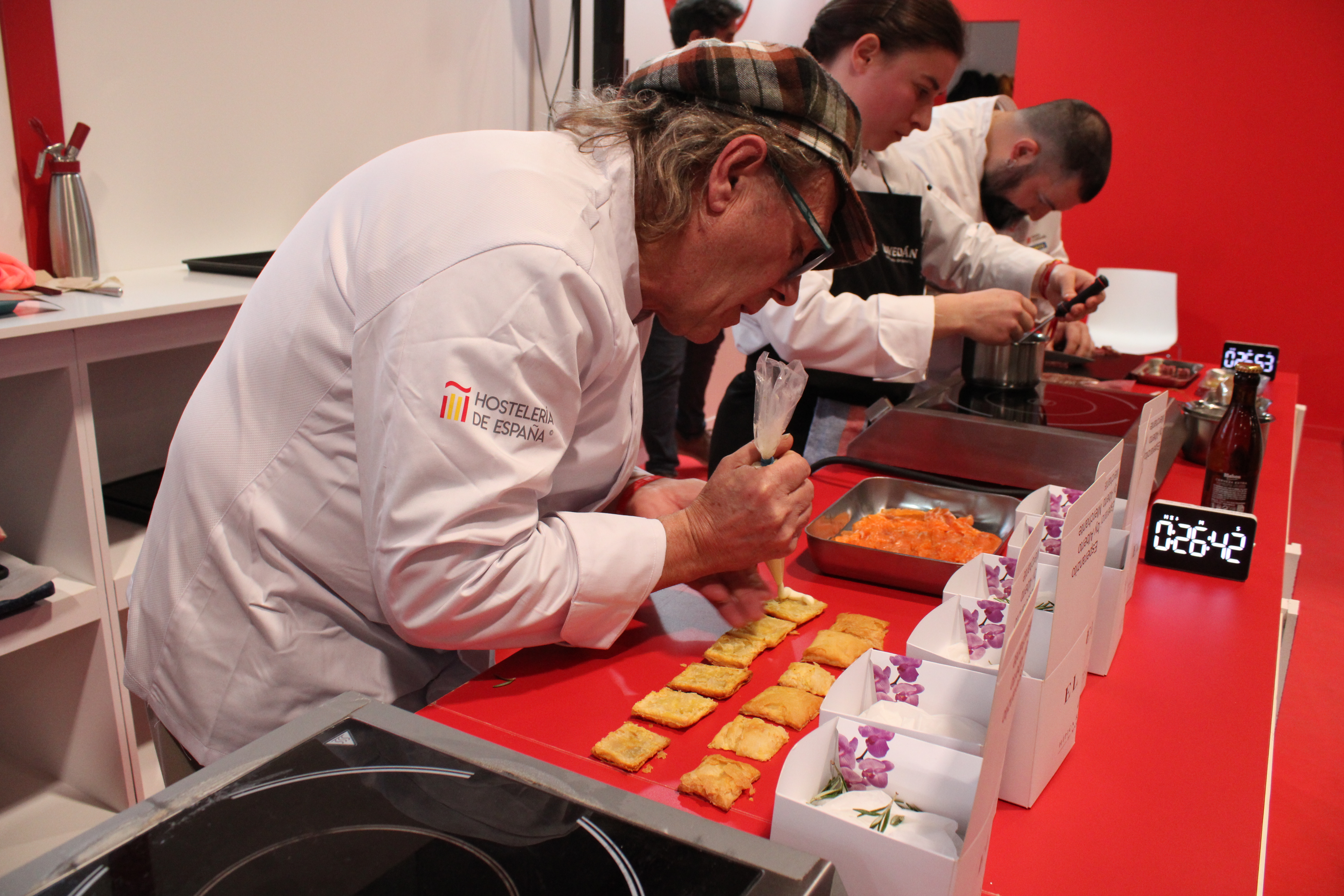Merchante, acompañado en todo momento por Marco Antonio Medina elaboraron en directo su tapa “Esperanzito, el impostor de la Mancha”, consistente en una masa rellena de una mousse bicolor de perdiz escabechada y trufa ahumada con un velo de miel y azafrán, todo, en un tiempo máximo de 30 minutos.