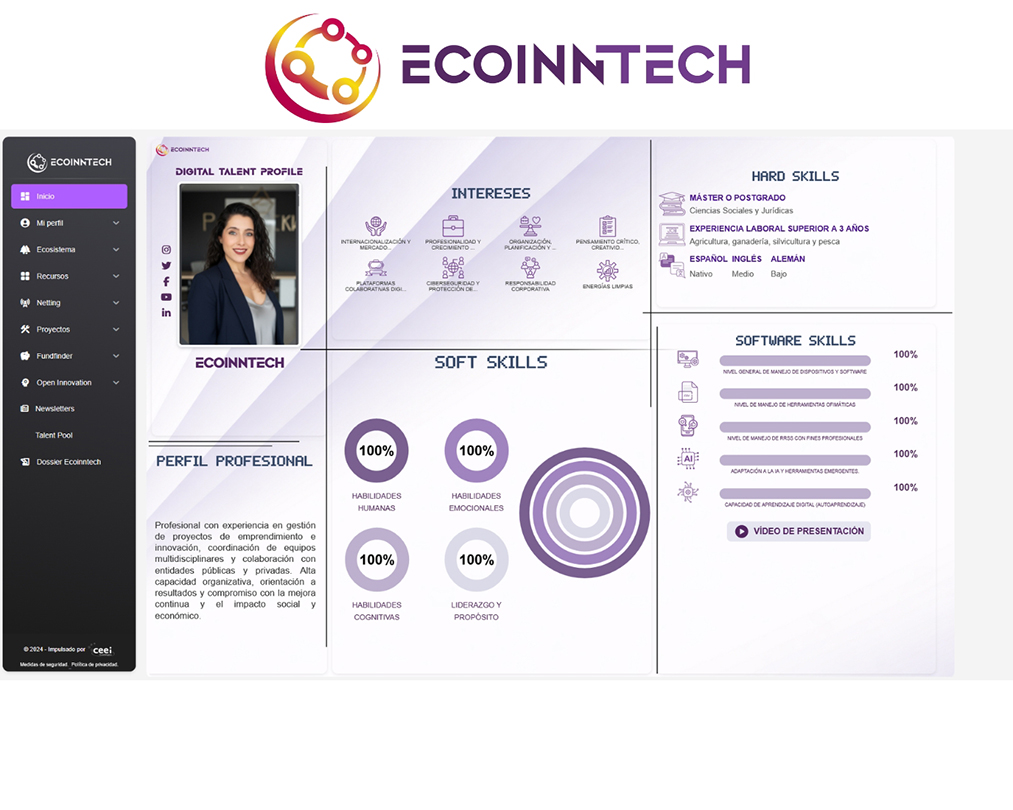 Gracias a este enfoque, el resto de usuarios de ECOINNTECH puede identificar perfiles no solo por su experiencia previa, sino por su encaje innovador, su capacidad de evolución y su alineación con necesidades reales del mercado. El objetivo es facilitar la detección de sinergias, oportunidades de colaboración, futuras incorporaciones o la acogida de estudiantes en prácticas tras la finalización de sus estudios.