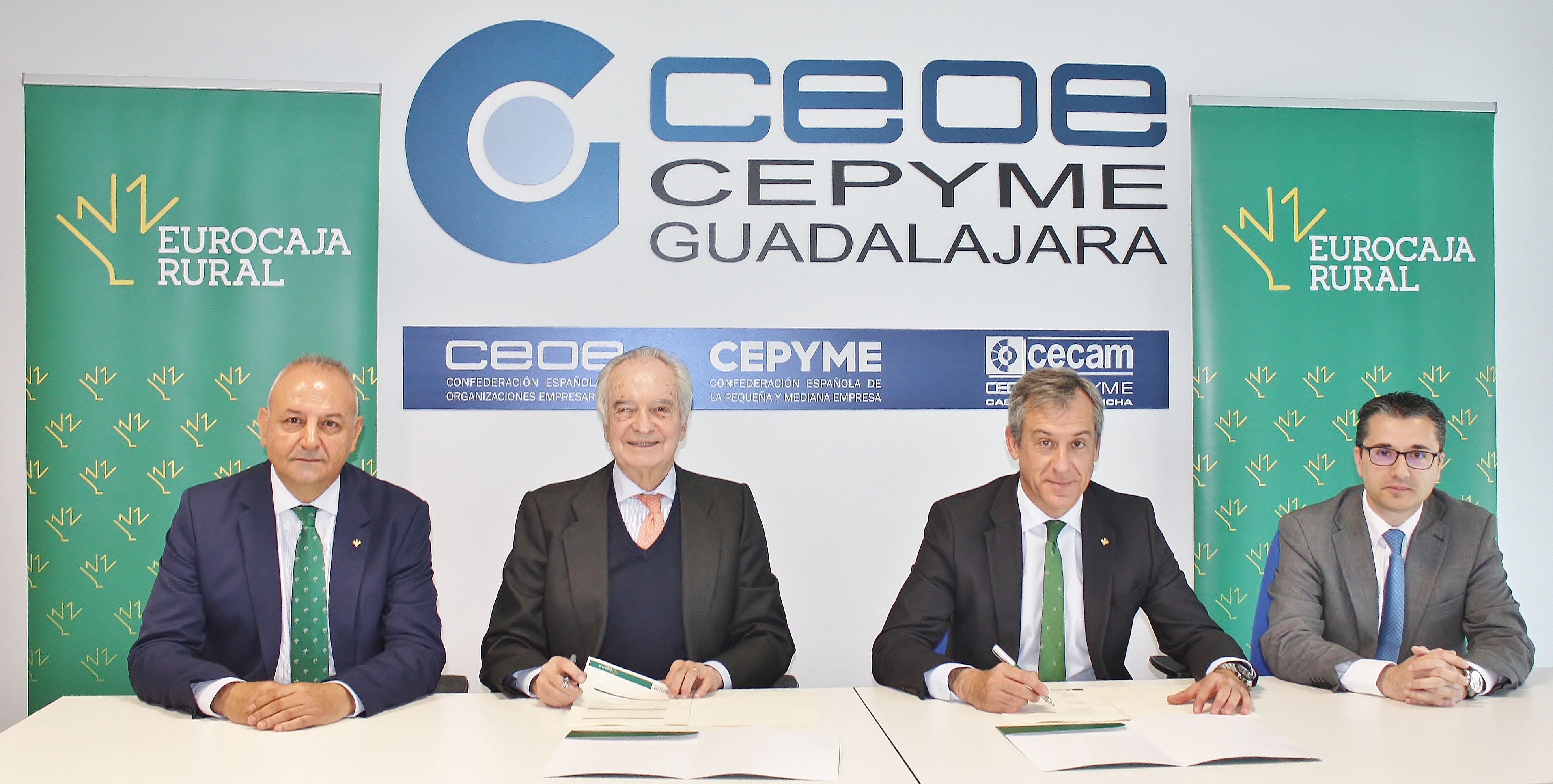 El acuerdo fue rubricado por el presidente de Eurocaja Rural, Javier López Martín, y el presidente de CEOE-CEPYME Guadalajara, Agustín de Grandes Pascual. Ambos responsables estuvieron acompañados en la firma por el director territorial de la entidad en Guadalajara, Afrodisio García, y el secretario general de la patronal alcarreña, Javier Arriola.