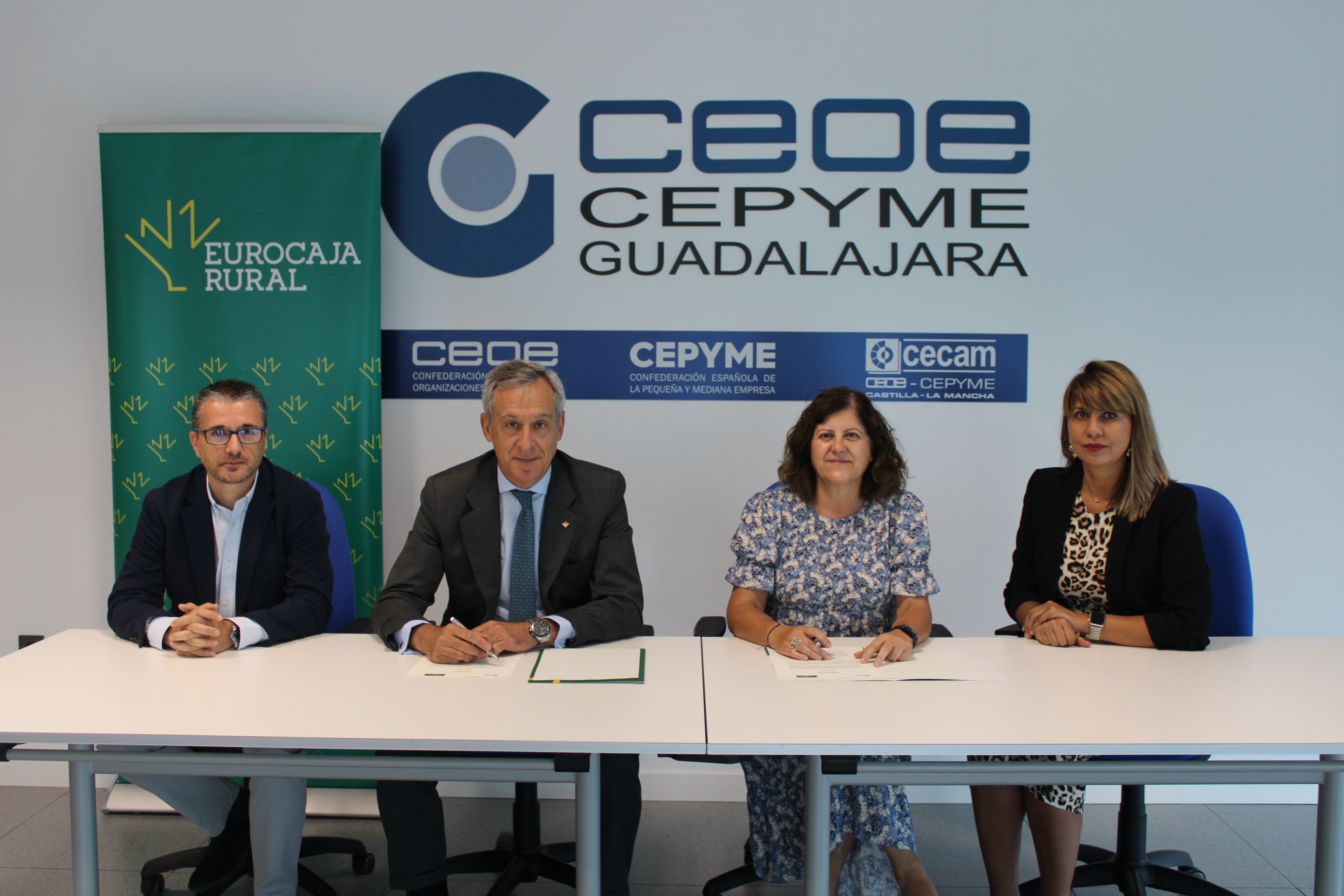 El convenio fue firmado en el Centro de Formación y Negocios de CEOE-CEPYME Guadalajara por el presidente de Eurocaja Rural, Javier López Martín, y la presidenta de CEOE-CEPYME Guadalajara, María Soledad García Oliva, en presencia del secretario general, Javier Arriola Pereira, y de la directora territorial de Eurocaja Rural en Guadalajara, Silvia Díaz.