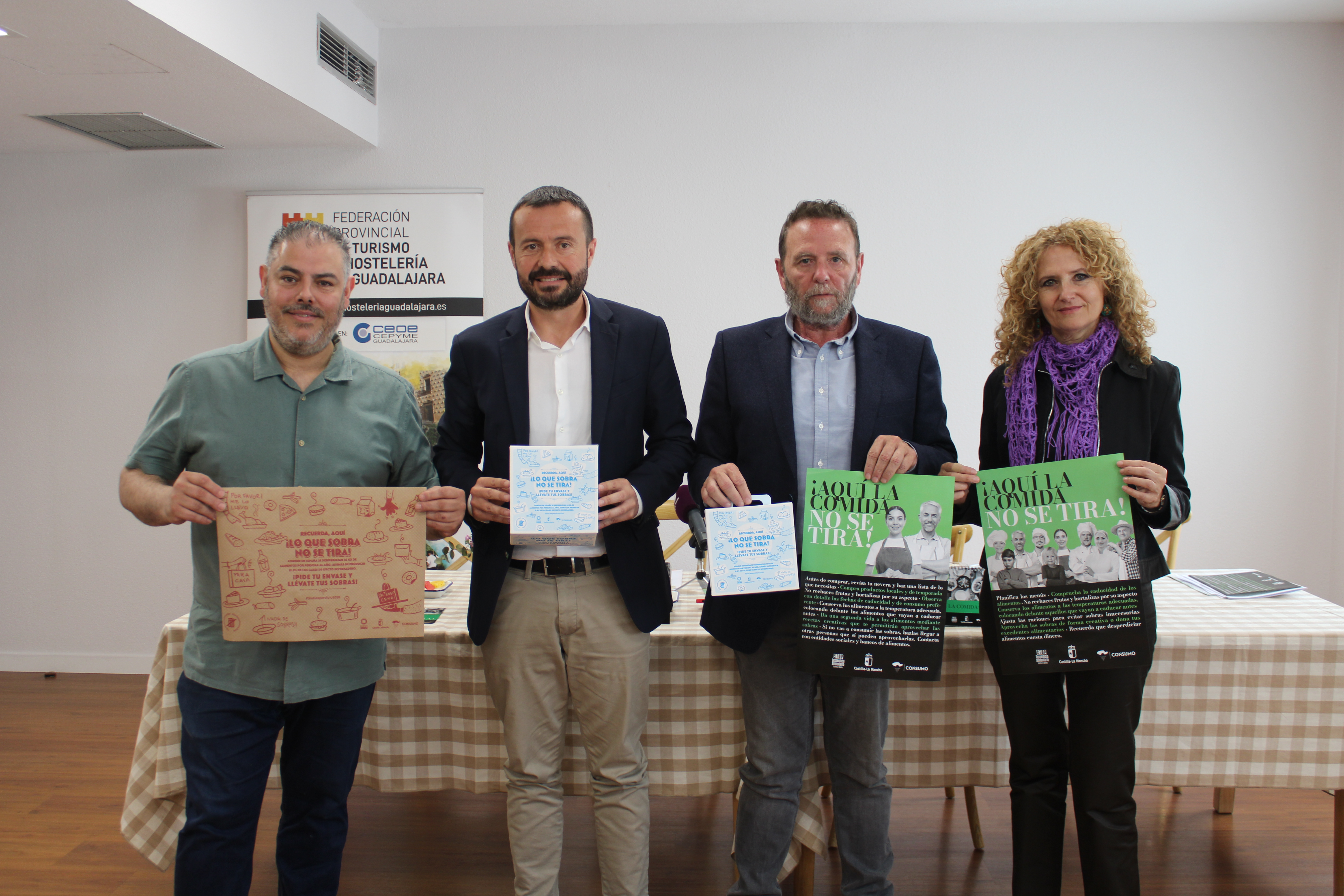 Guadalajara, 23 de mayo de 2024.- El Gobierno de Castilla-La Mancha, a través de la Consejería de Sanidad, y la Federación Provincial de Hostelería y Turismo de Guadalajara, integrada en CEOE-CEPYME Guadalajara, han presentado hoy la iniciativa ‘Aquí la comida no se tira’, una campaña para visibilizar y concienciar acerca de la reducción del desperdicio alimentario que se va a implementar en muchos establecimientos hosteleros de la provincia de Guadalajara, así como en los Ayuntamientos de la provincia e incluso en centros educativos, ya en el próximo curso escolar, en este caso.