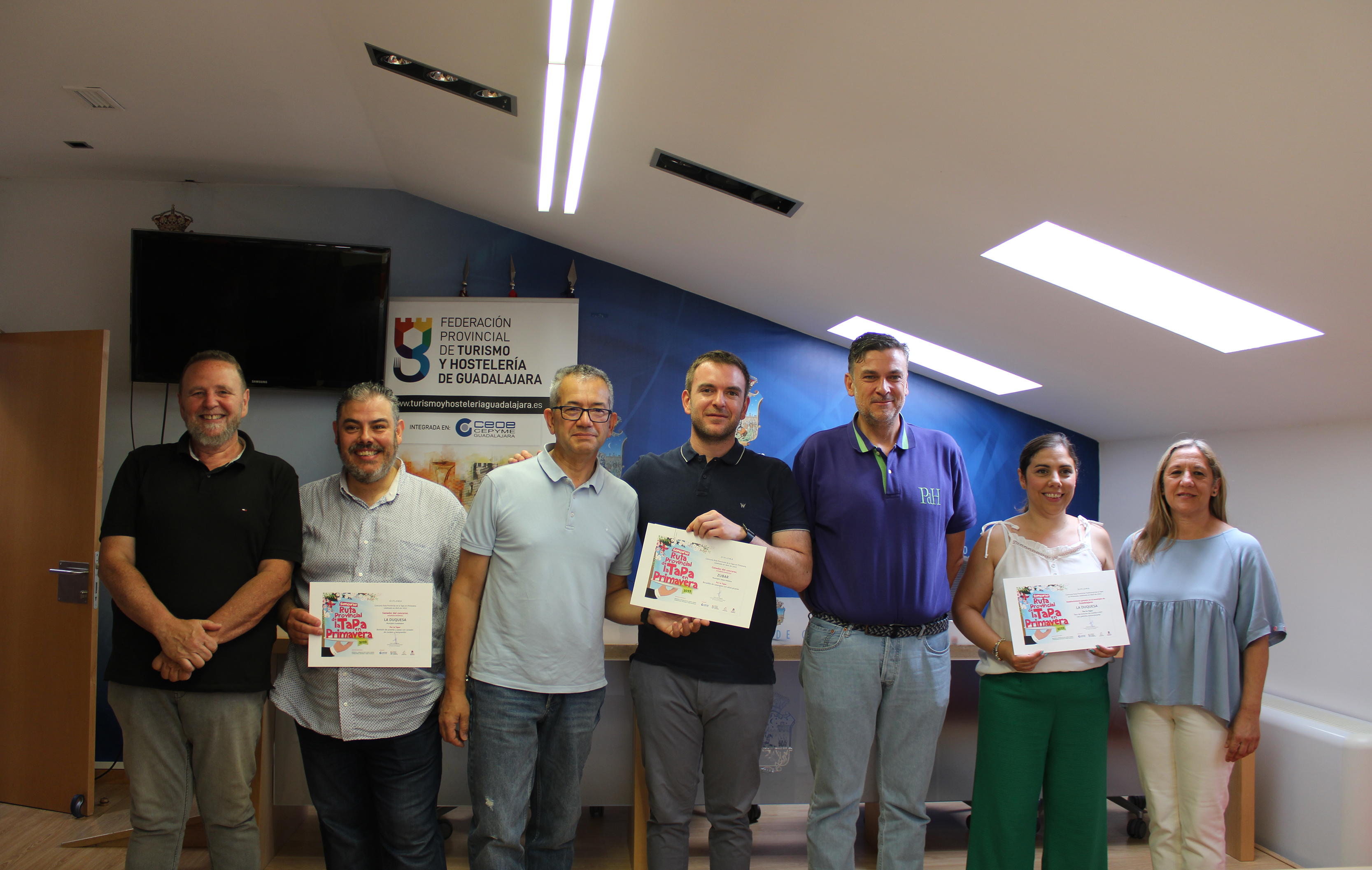 Unos diplomas que han sido entregados por Juan Luis Pajares, presidente de la Federación provincial de Turismo y Hostelería de Guadalajara, Fernando Parlorio, concejal de Turismo del Ayuntamiento de Guadalajara, Rosa Abel, diputada de Promoción Económica de la Diputación Provincial de Guadalajara, Jéssica Méndez y Abigail Cordero, concejalas de Servicios Sociales, Sanidad y Consumo y de Empleo del Ayuntamiento de Cabanillas del Campo, respectivamente y por José Miguel Cocera, alcalde de Yebes.
