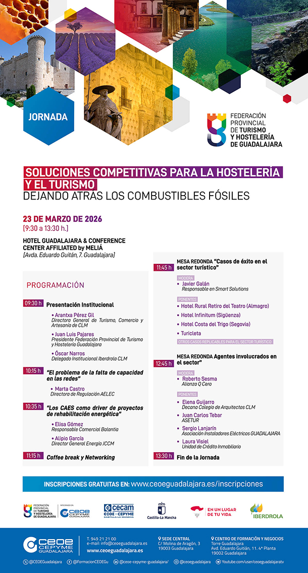 Guadalajara, 13 de marzo 2026. La Federación provincial de Turismo y Hostelería de Guadalajara, integrada en CEOE-CEPYME Guadalajara ha organizado para el próximo lunes 23 de marzo de 9:30 a 13:30 horas, una jornada formativa que, bajo el título “Soluciones competitivas para la hostelería y el turismo, dejando atrás los combustibles fósiles”, que contará con dos conferencias y dos mesas redondas.