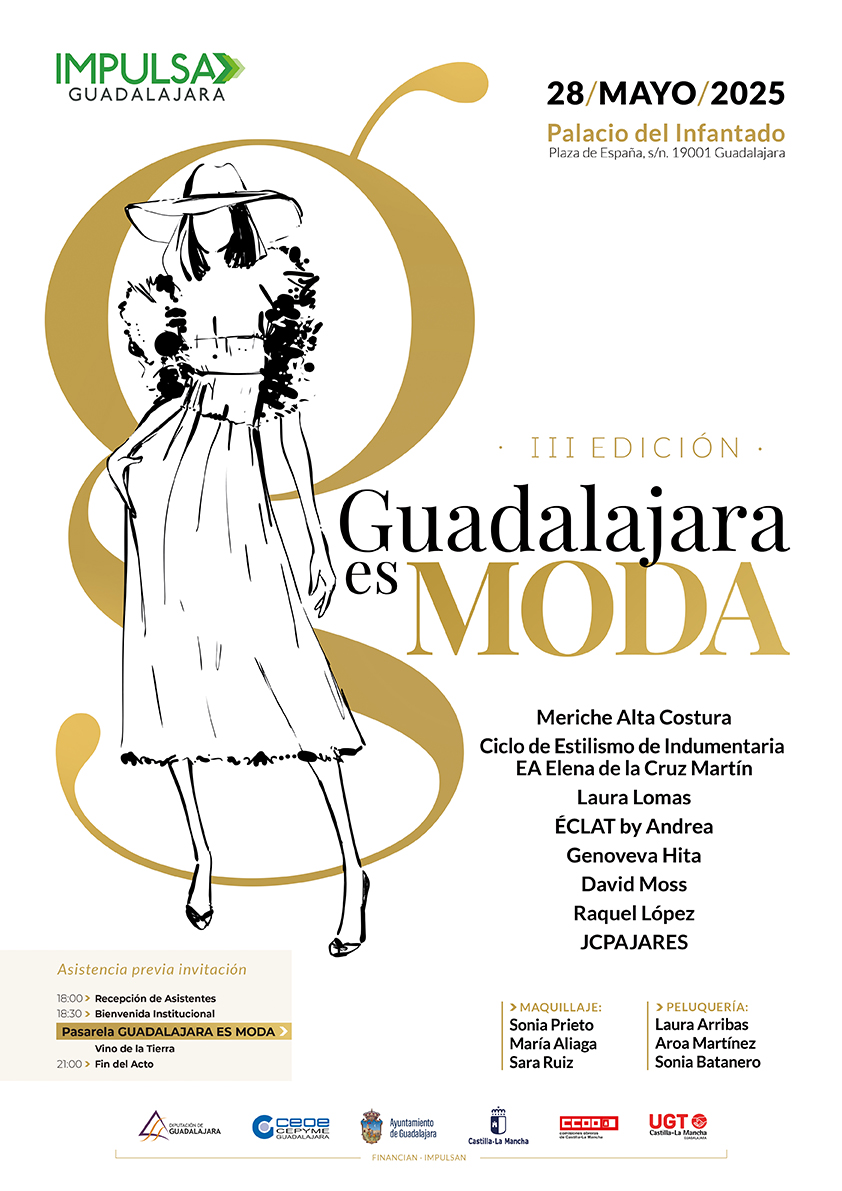 Guadalajara, 23 de mayo de 2025, La tercera edición de Guadalajara Es Moda tendrá lugar el próximo 28 de mayo en el Palacio del Infantado de Guadalajara. Una iniciativa de Impulsa Guadalajara que pone en valor, en esta ocasión, el talento de los siete diseñadores de moda de la provincia de Guadalajara y los alumnos del módulo de Estilismo de Indumentaria de la Escuela de Arte Elena de la Cruz Martín. Sin olvidarse del elenco que hace posible un desfile completo como con los profesionales del sector de la peluquería y el maquillaje.