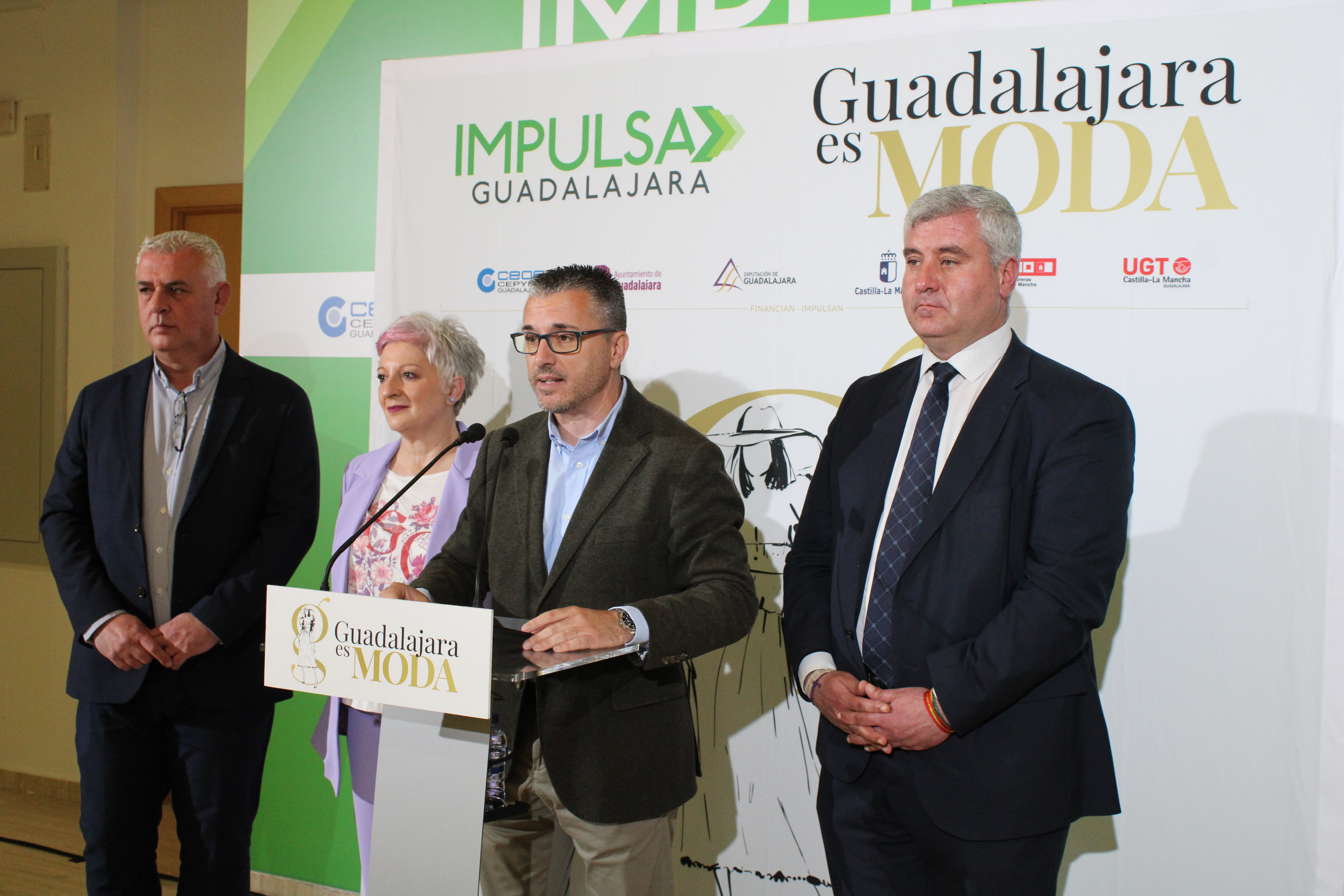 Alfonso Esteban, teniente alcalde de Guadalajara, José Luis Vega, presidente de la Diputación provincial de Guadalajara, Rosa María García, delegada de la Junta de Comunidades de Castilla-La Mancha en Guadalajara, junto con Javier Arriola, secretario general de CEOE-CEPYME Guadalajara, han sido los encargados de presentar esta nueva edición de Guadalajara Es Moda.