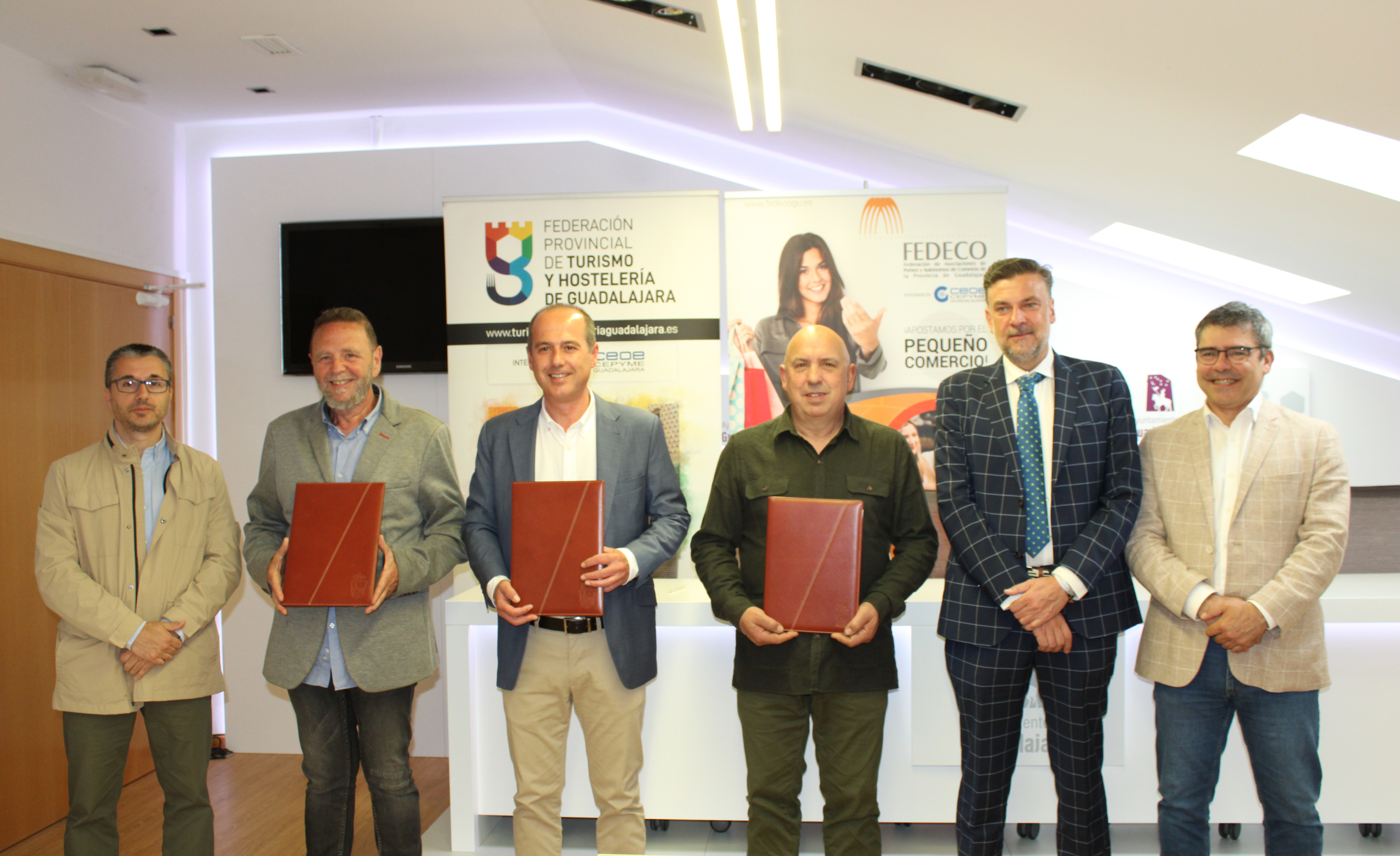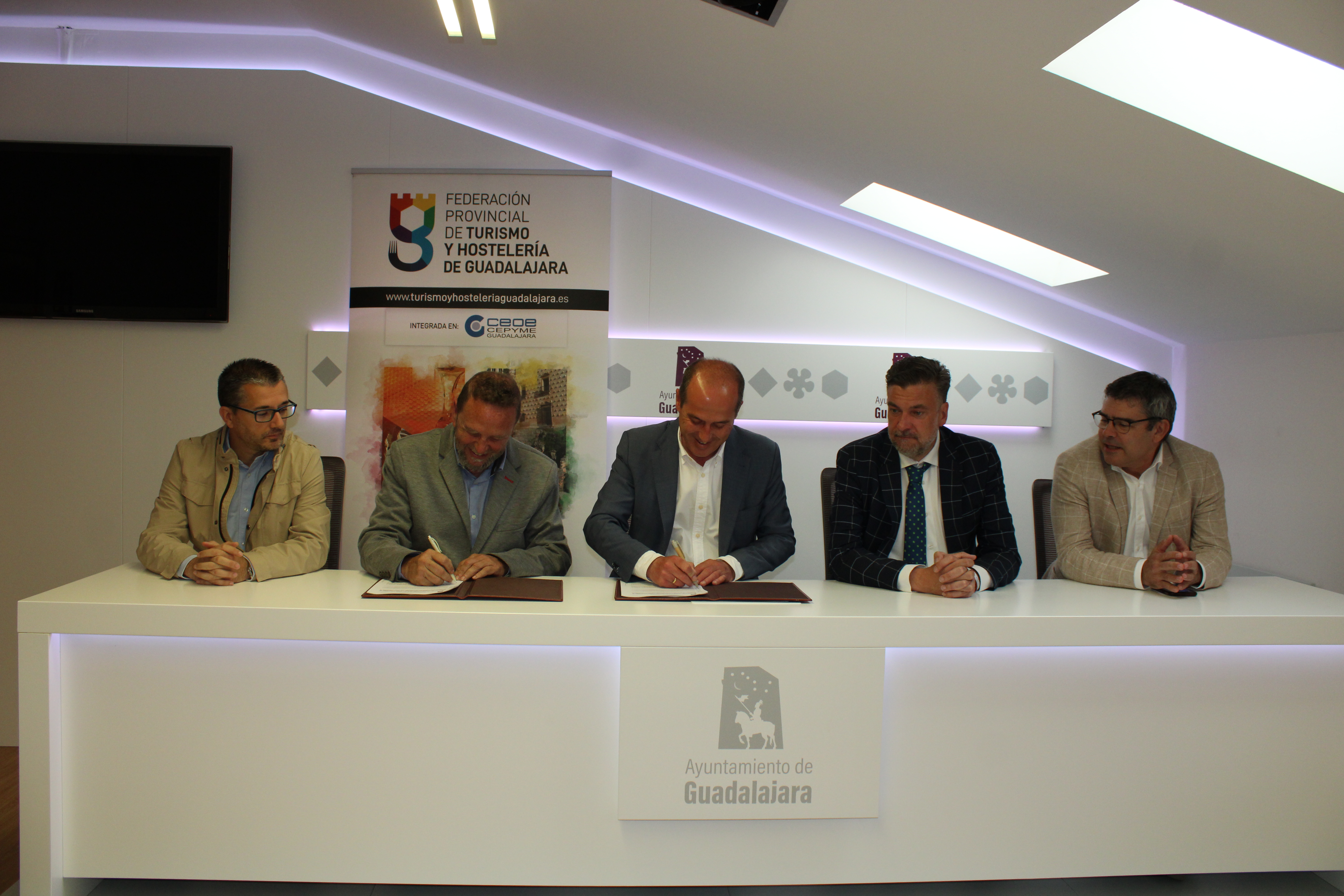 En la firma, que ha tenido lugar en el Ayuntamiento de Guadalajara, han estado presentes los presidentes la federación de Turismo y FEDECO, Juan Luis Pajares y Ángel Escribano, respectivamente junto con Alberto Rojo, alcalde de Guadalajara; Santiago Baeza, tercer teniente de alcalde y Fernando Parlorio, concejal de Comercio y Turismo del consistorio capitalino, quienes han estado acompañados por Javier Arriola, secretario general de CEOE-CEPYME Guadalajara y Santiago Baeza, tercer teniente de alcalde y concejal de Promoción Económica del Ayuntamiento de Guadalajara.