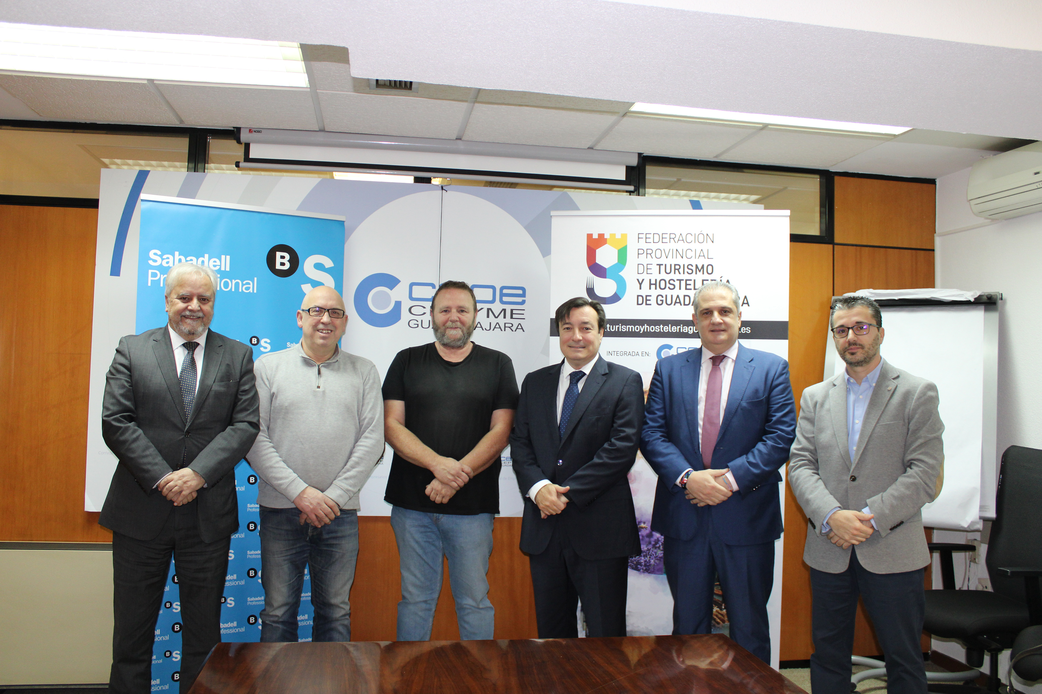 Guadalajara, 14 de febrero de 2020, Los presidentes de la Federación provincial de Turismo y Hostelería de la provincia de Guadalajara, y de FEDECO, Juan Luis Pajares y Ángel Escribano, respectivamente y Carlos Martín García, director institucional territorial de Banco Sabadell, han firmado un convenio de colaboración entre ambas entidades por el cual, las empresas y empresarios asociados a estas federaciones, integradas en CEOE-CEPYME Guadalajara, podrán beneficiarse de productos y servicios en condiciones preferentes.