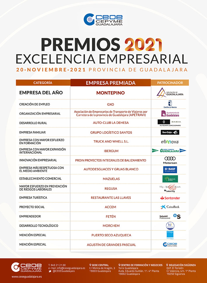 LISTA DE PREMIADOS DE LOS PREMIOS EXCELENCIA EMPRESARIAL CEOE-CEPYME GUADALAJARA 2021
