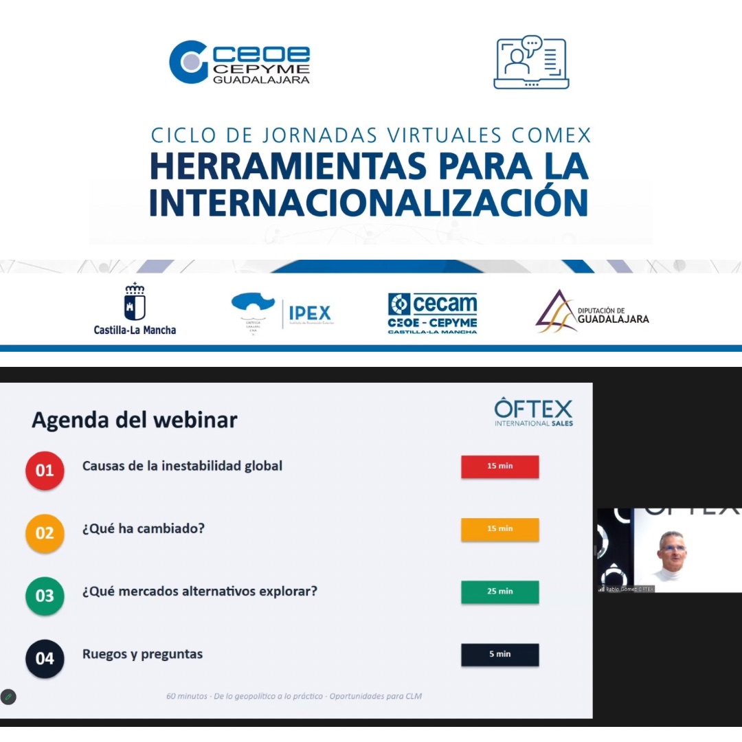 La última de las jornadas gratuitas de este ciclo virtual de comercio exterior organizado por el departamento de Comercio Exterior de CEOE-CEPYME Guadalajara se tituló “Diversificación estratégica: Mercados alternativos frente a la inestabilidad global”, donde se vieron las causas de la inestabilidad, qué es lo que ha cambiado y se buscaron mercados alternativos.