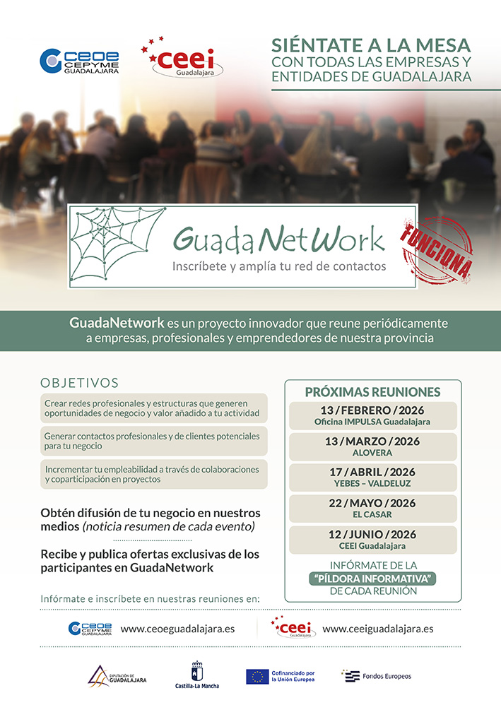 GuadaNetWork es un proyecto impulsado conjuntamente por CEOE-CEPYME Guadalajara y el CEEI de Guadalajara, con la colaboración de la Diputación Provincial de Guadalajara, la Junta de Comunidades de Castilla-La Mancha y los ayuntamientos de las localidades que acogen los encuentros.